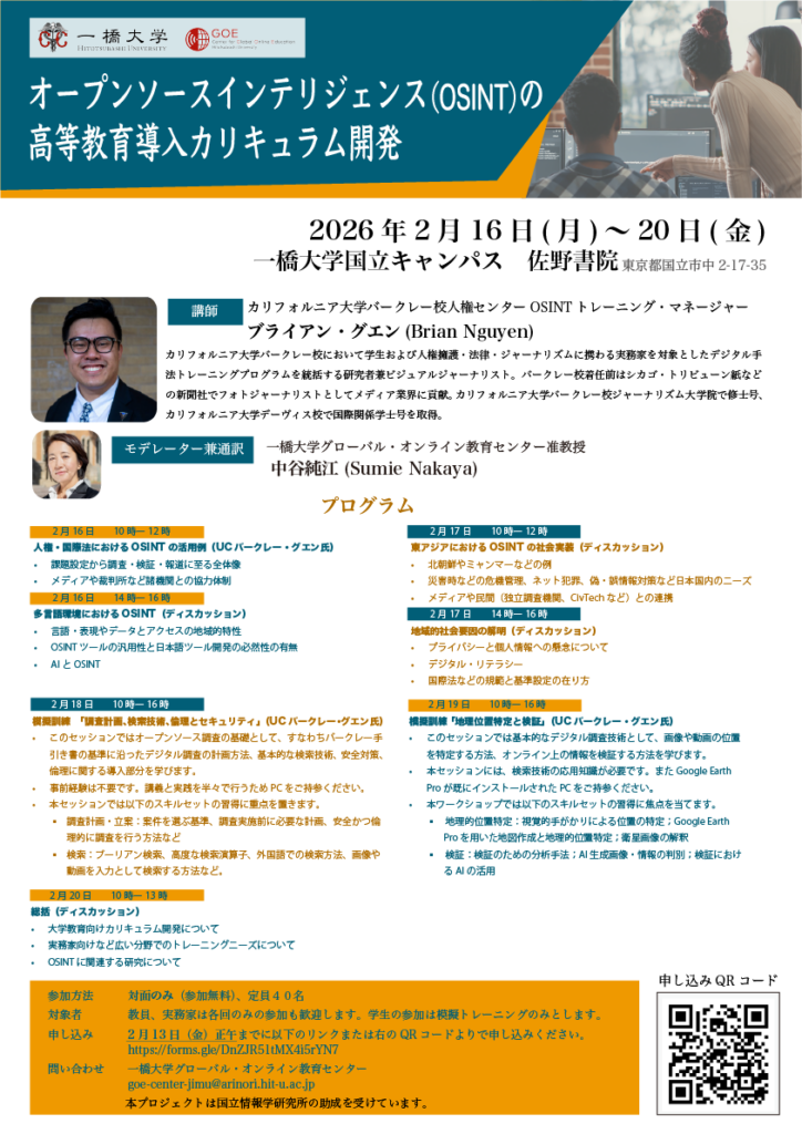 欧米を中心に国際政治の分析手法として重要性を増しているオープンソースインテリジェンス(Open Source Intelligence : OSINT)は、ソーシャルメディア、公開データ、衛星画像や地理情報システムなどの解析を組み合わせ、軍事行動や人権侵害の状況を解明するものです。本プロジェクトでは、大学教育にOSINTを先駆的に導入したカリフォルニア大学バークレー校の人権センターと連携し、日本国内の高等教育向けのOSINTカリキュラム開発を目指します。その第一歩として、日本を含めた東アジア地域におけるOSINTの現状とニーズを議論した上で、模擬訓練を実施し、今後の展開を考えます。模擬訓練では国連人権高等弁務官事務所とバークレー校が共同で出版したバークレーOSINT手引書の日本語訳を参照します。